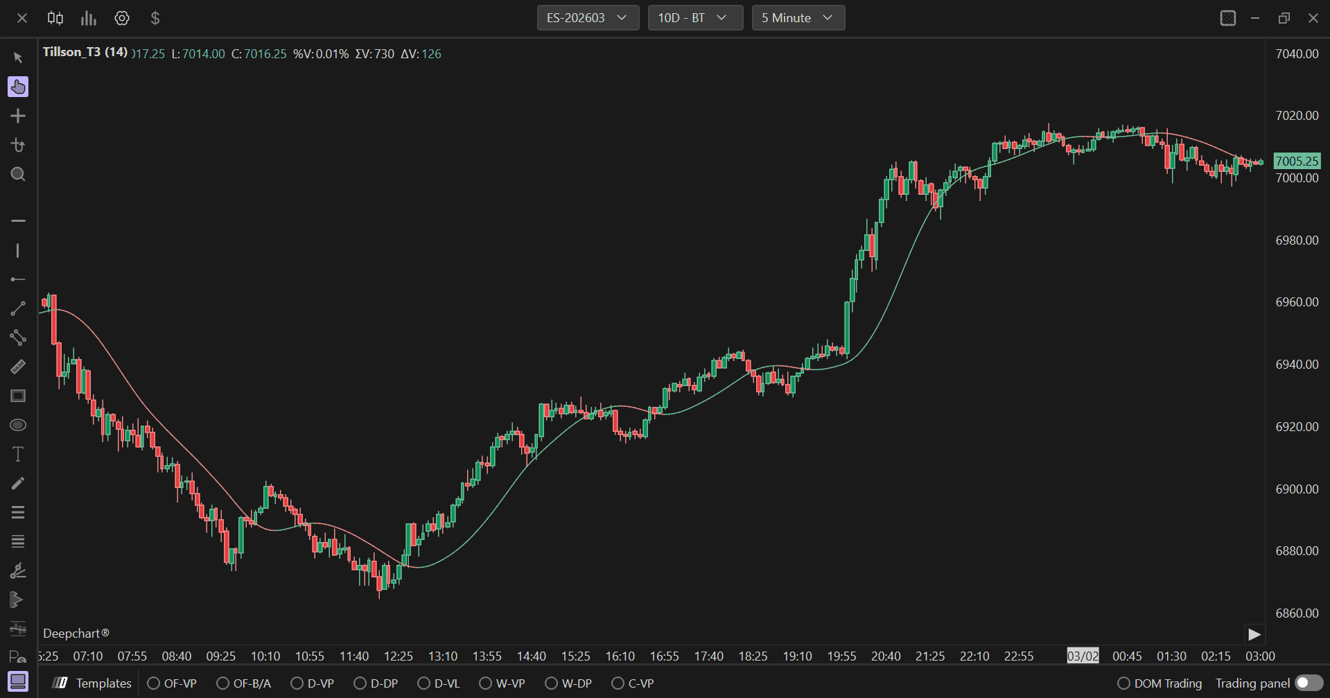 The Tillson T3 is an advanced smoothing indicator developed by Tim Tillson that provides superior lag reduction compared to traditional moving averages. It uses a sophisticated multi-stage exponential moving average calculation combined with a volume factor to create a highly responsive yet smooth trend-following indicator. The T3 indicator reduces noise while maintaining close tracking of price movements, making it particularly useful for identifying trend direction and potential entry/exit points with minimal delay.