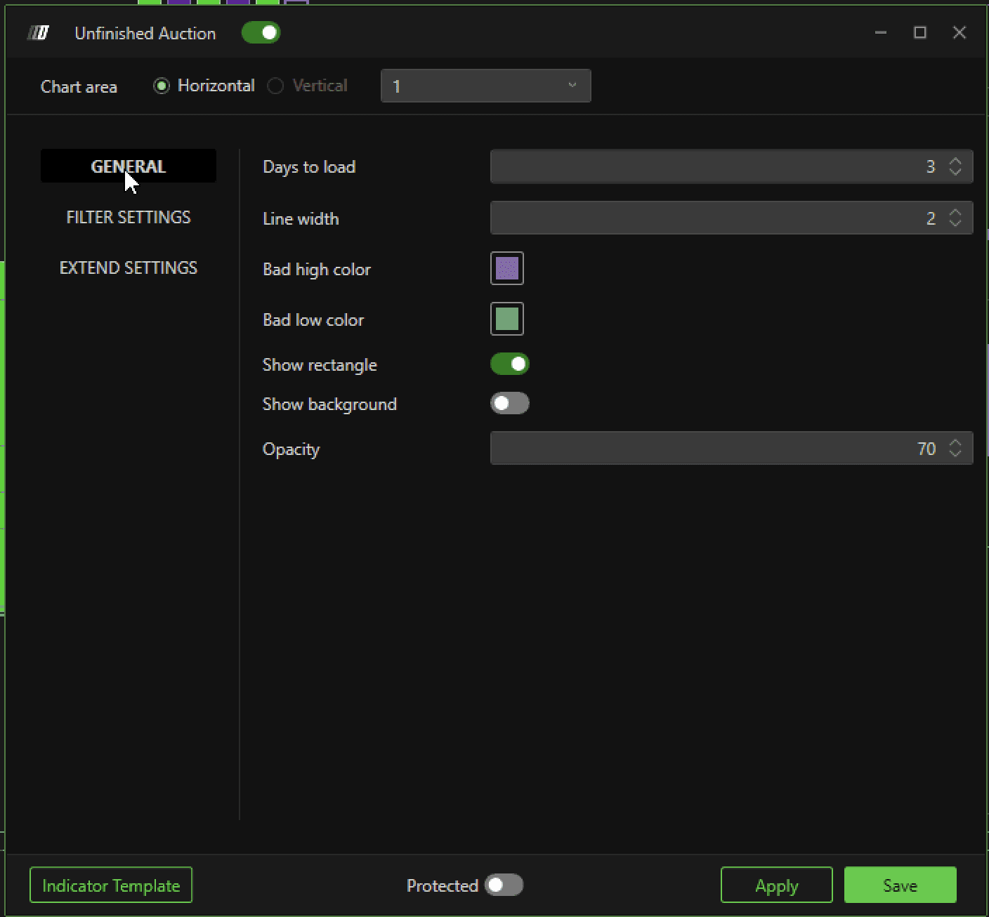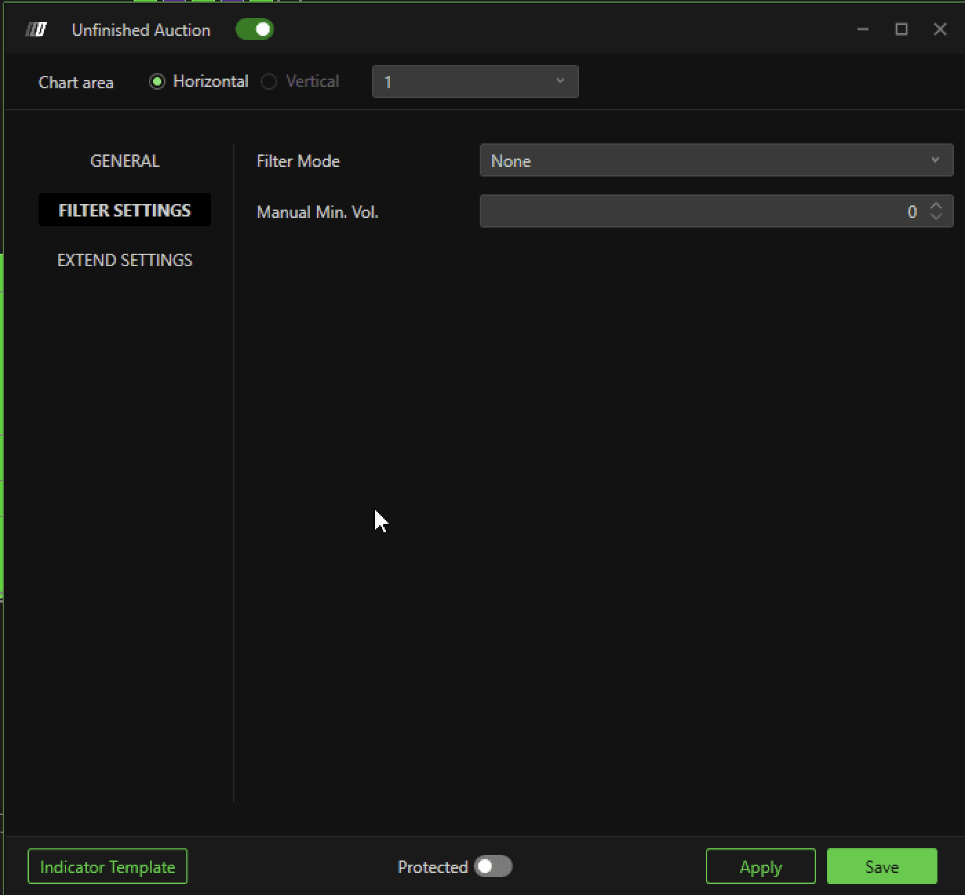 If placed on manual it allows to apply a filter on the minimum volume, useful to highlight only the most relevant Bad High/Low, which are more likely to be taken up by the market.