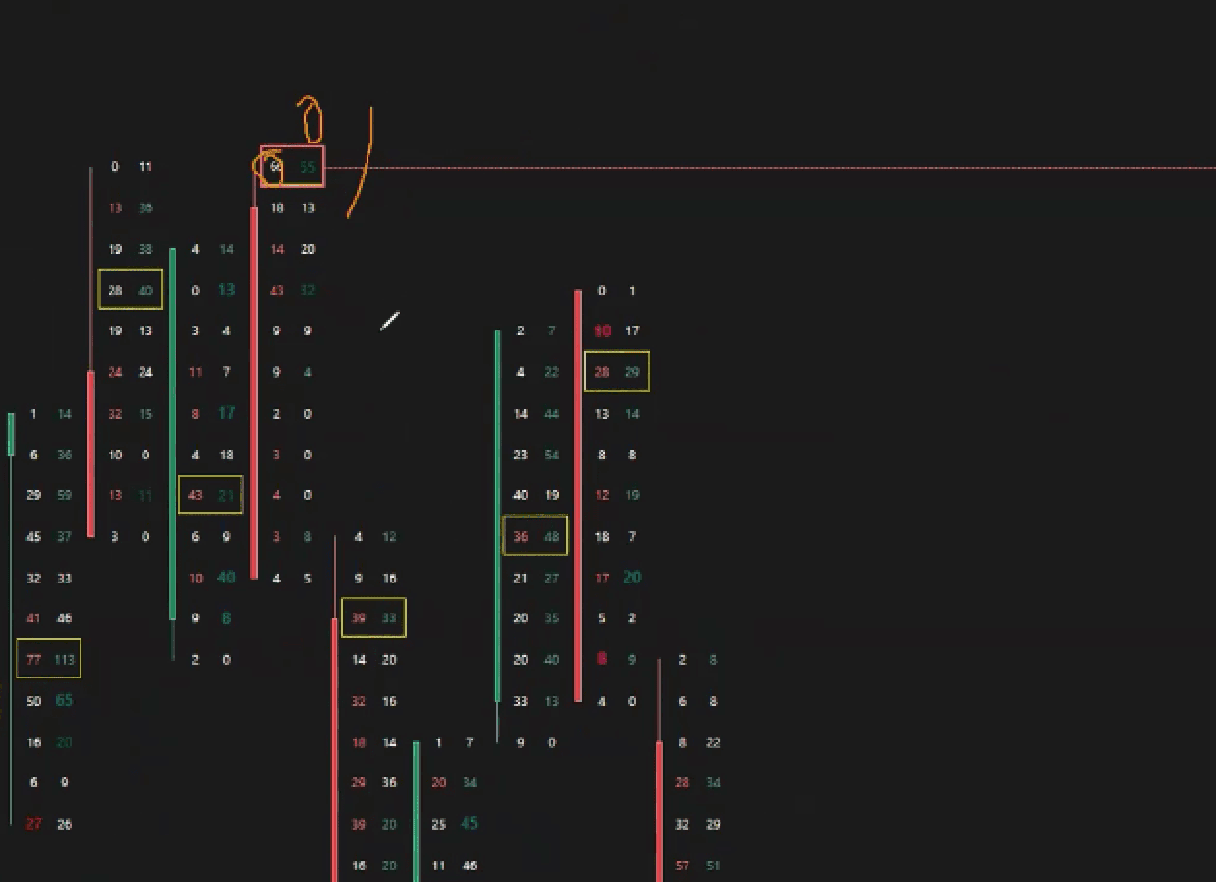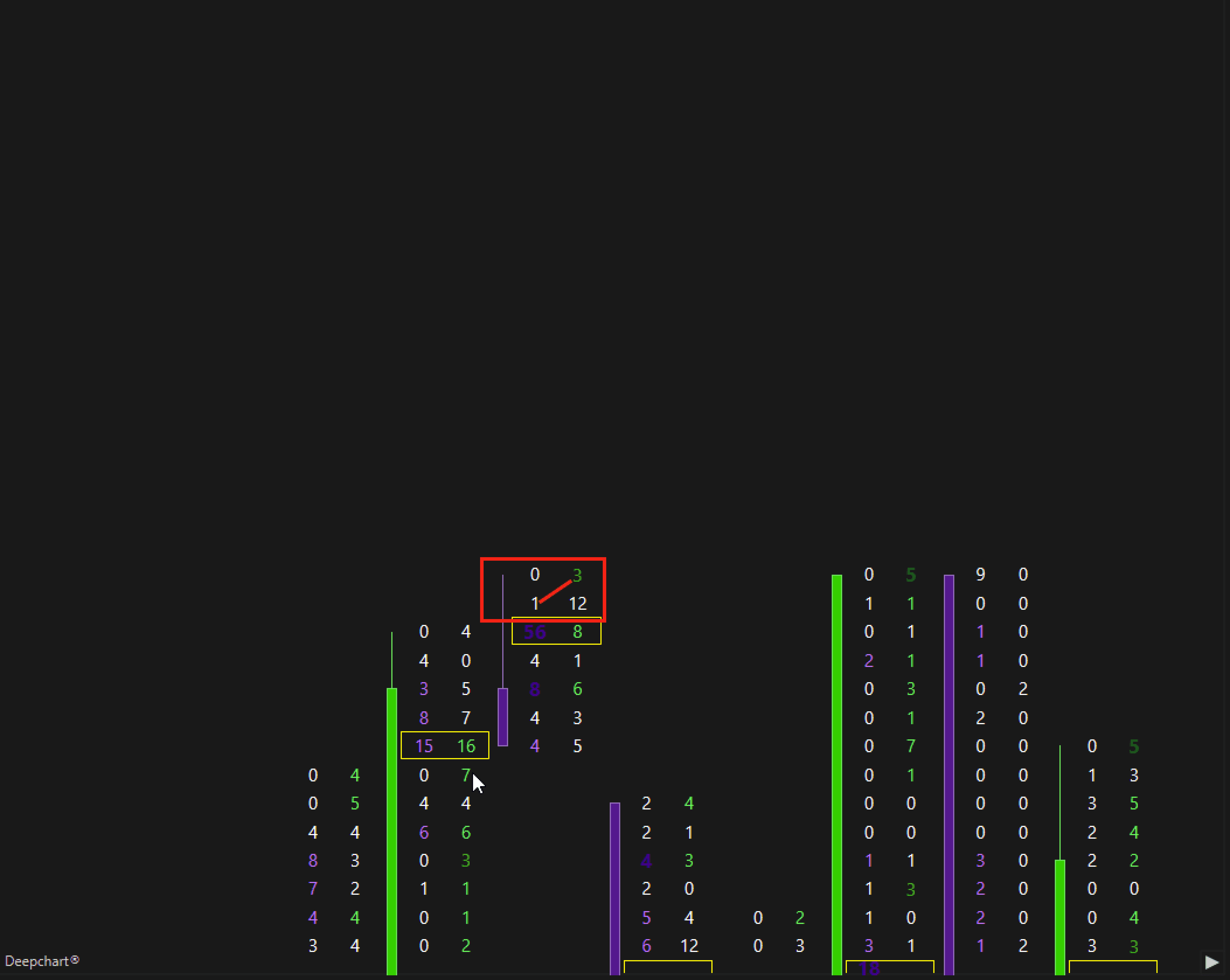 The Unfinished Auction indicator from DeepChart allows us to highlight "anomalies" in the trading auction. In fact, normally in the high tick of a candle we will find a 0 in Bid and x contracts traded in Ask while in the low tick we will find x contracts traded in Bid and 0 in Ask, when this is not the case, that is, when there are contracts traded on the high tick in Bid or the low tick in Ask, the indicator will show a rectangle.